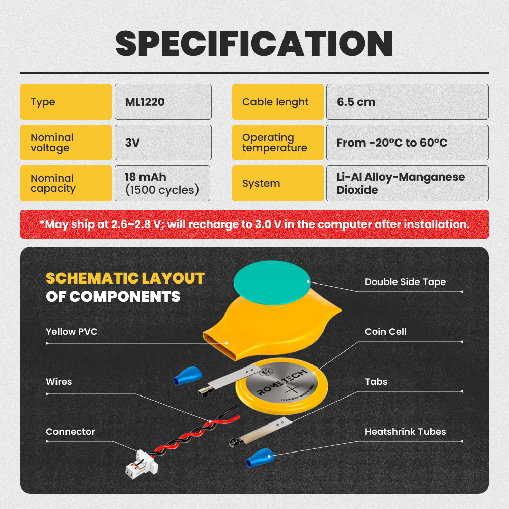 The Rome Tech motherboard battery is excellent for replacing a dead OEM battery. High-quality materials and workmanship guarantee a long service life, even under extreme conditions. As a result, our battery is an ideal choice for devices that require a reliable and long-lasting power source.