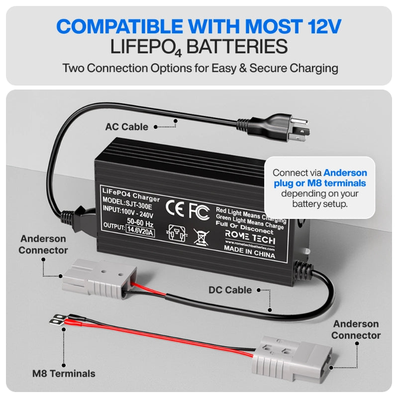 - Safe Charging. Our 14.6V 20A chargers equip with reverse polarity protection, output short circuit protection, output overvoltage protection, and battery isolation protection to prevent instability factors during the charging process.