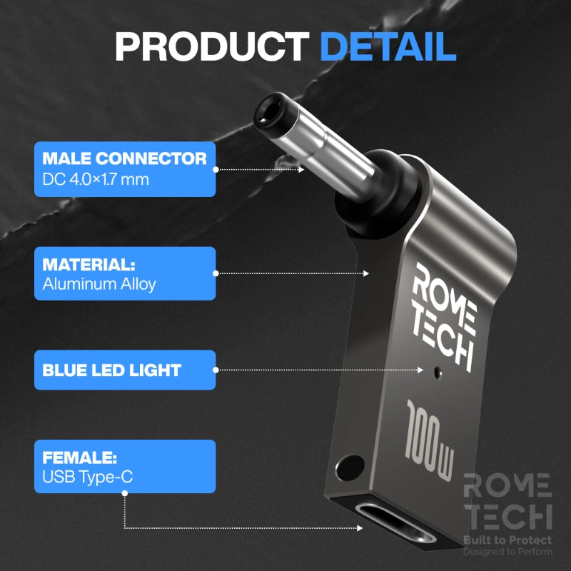 - USB Type-C to DC 4.0 x 1.7 mm Jack Plug Converter - Female USB Type-C to Male 4.0 x 1.7 mm. 100W connector plug that can connect laptop to a power delivery AC adapters, so you can use your power delivery charger cable with your laptop as well as your cell phone.
