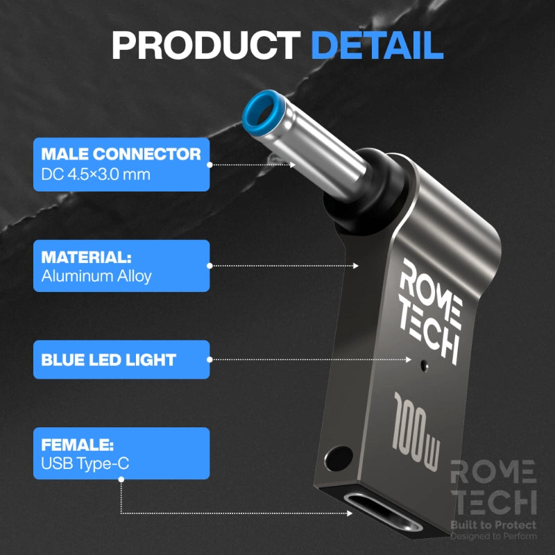 - USB Type-C to DC 4.5 x 3.0 mm Jack Plug Converter - Female USB Type-C to Male 4.5 x 3.0 mm. 100W connector plug that can connect laptop to a power delivery AC adapters, so you can use your power delivery charger cable with your laptop as well as your cell phone.