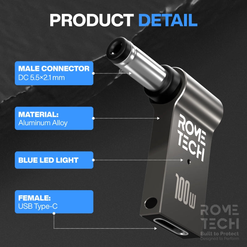 - USB Type-C to DC 5.5 x 2.1 mm Jack Plug Converter - Female USB Type-C to Male 5.5 x 2.1 mm. 100W connector plug that can connect laptop to a power delivery AC adapters, so you can use your power delivery charger cable with your laptop as well as your cell phone.