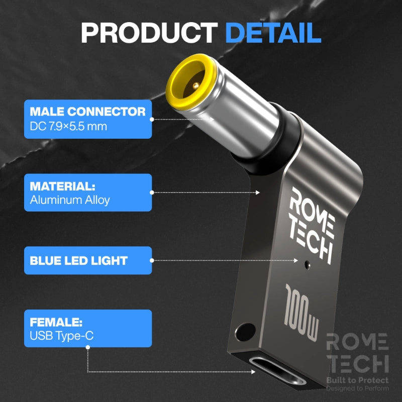 - USB Type-C to DC 7.9 x 5.5 mm Jack Plug Converter - Female USB Type-C to Male 7.9 x 5.5 mm. 100W connector plug that can connect laptop to a power delivery AC adapters, so you can use your power delivery charger cable with your laptop as well as your cell phone.